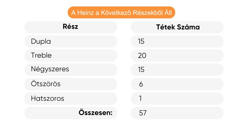 Ha Heinz fogadásokat köt , ez azt jelenti, hogy 57 fogadásra és hat különböző választásra fogad – hatszoros halmozásra, hat ötszörös, tizenöt négyszeres, 20 hármas és 15 páros fogadásra.