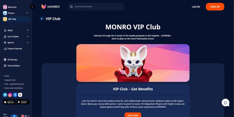 Hűségprogram – A Monro fogadási oldal keresi a módját, hogy új játékosokat hozzon, miközben megtartja a meglévőket. Egy speciális VIP program remek módja annak, hogy a meglévő játékosokat jobban bevonják, és a legaktívabb játékosoknak még több előnyt biztosítsanak.