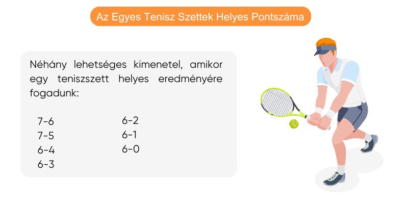 A tenisz szettfogadásban a pontszámokra is fogadhat. Az adott szetten belül megnyert játékok száma határozza meg a szettpontszámokat. Sok profi teniszmérkőzésen az első hat játékot megnyerő játékosok egy szett győzteseként is kikerülnek.